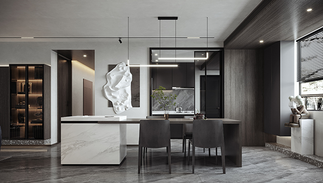 餐厅于进门左侧,设计为半开放式布局。将解构主义的美学内化于空间,空间的层次也更加丰富。嵌入式的极简设计节省空间的同时更让人赏心悦目。岛台与餐桌相连,大理石纹理的岛台,让其用餐的同时兼具观赏性,既美观又实用。