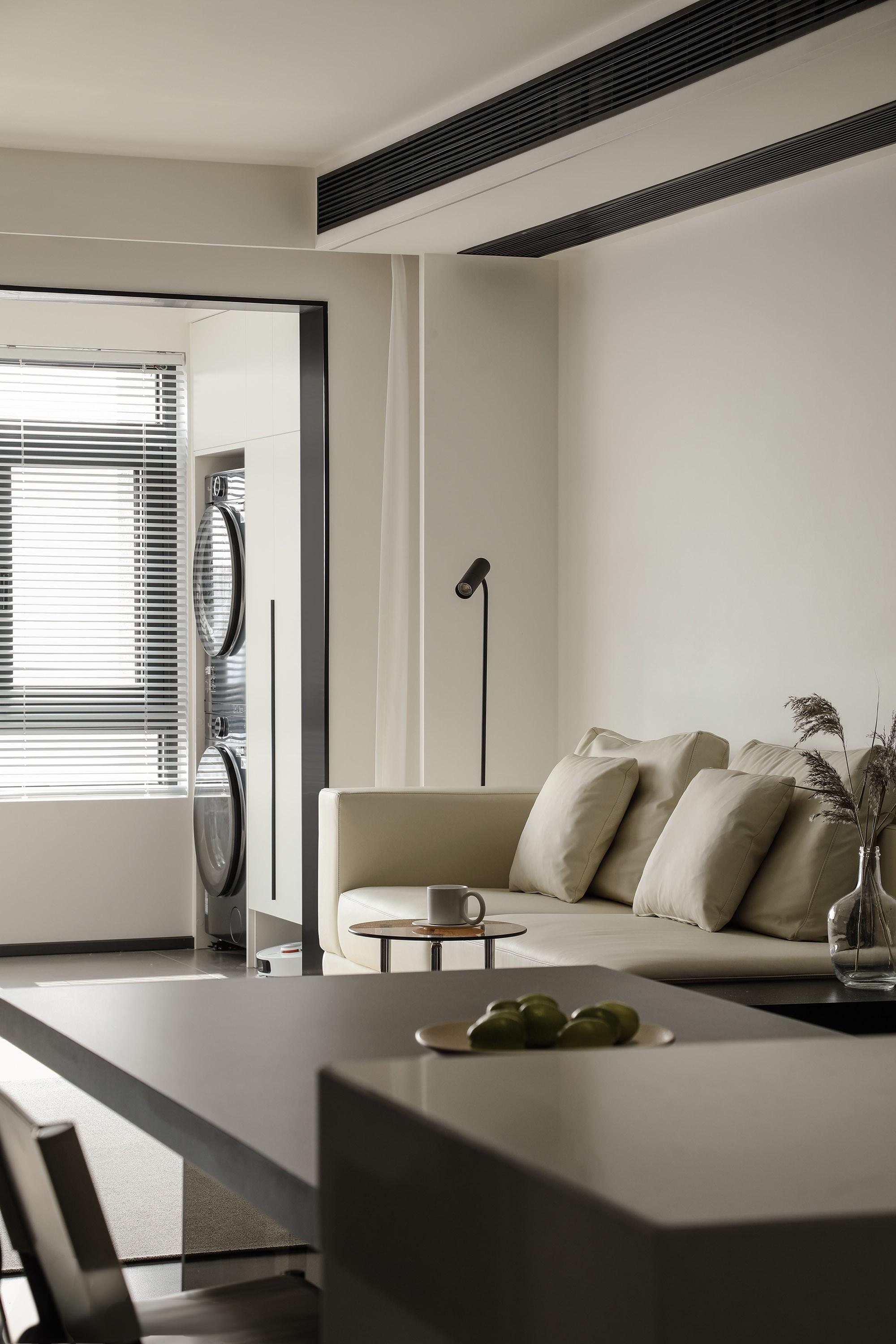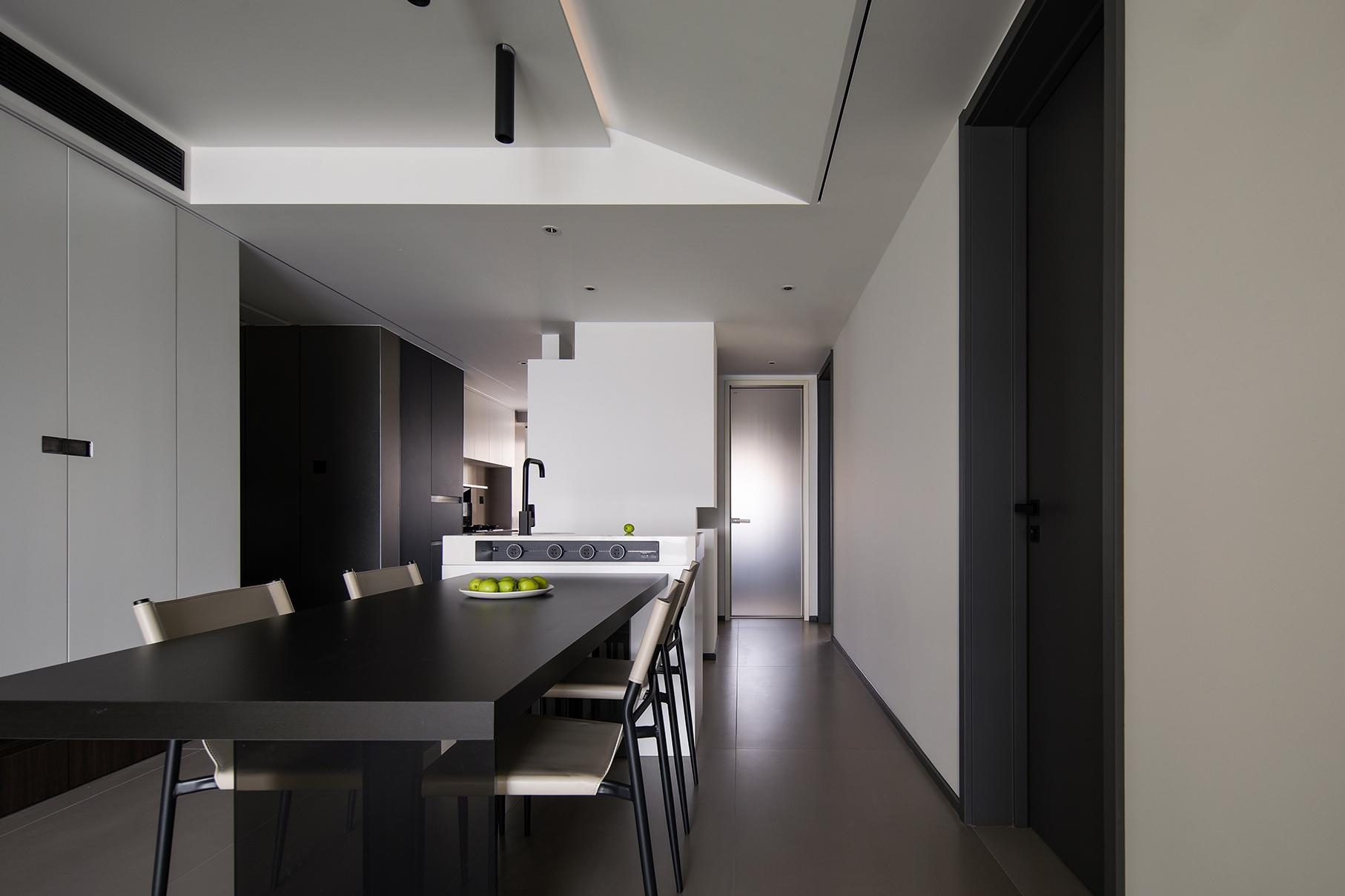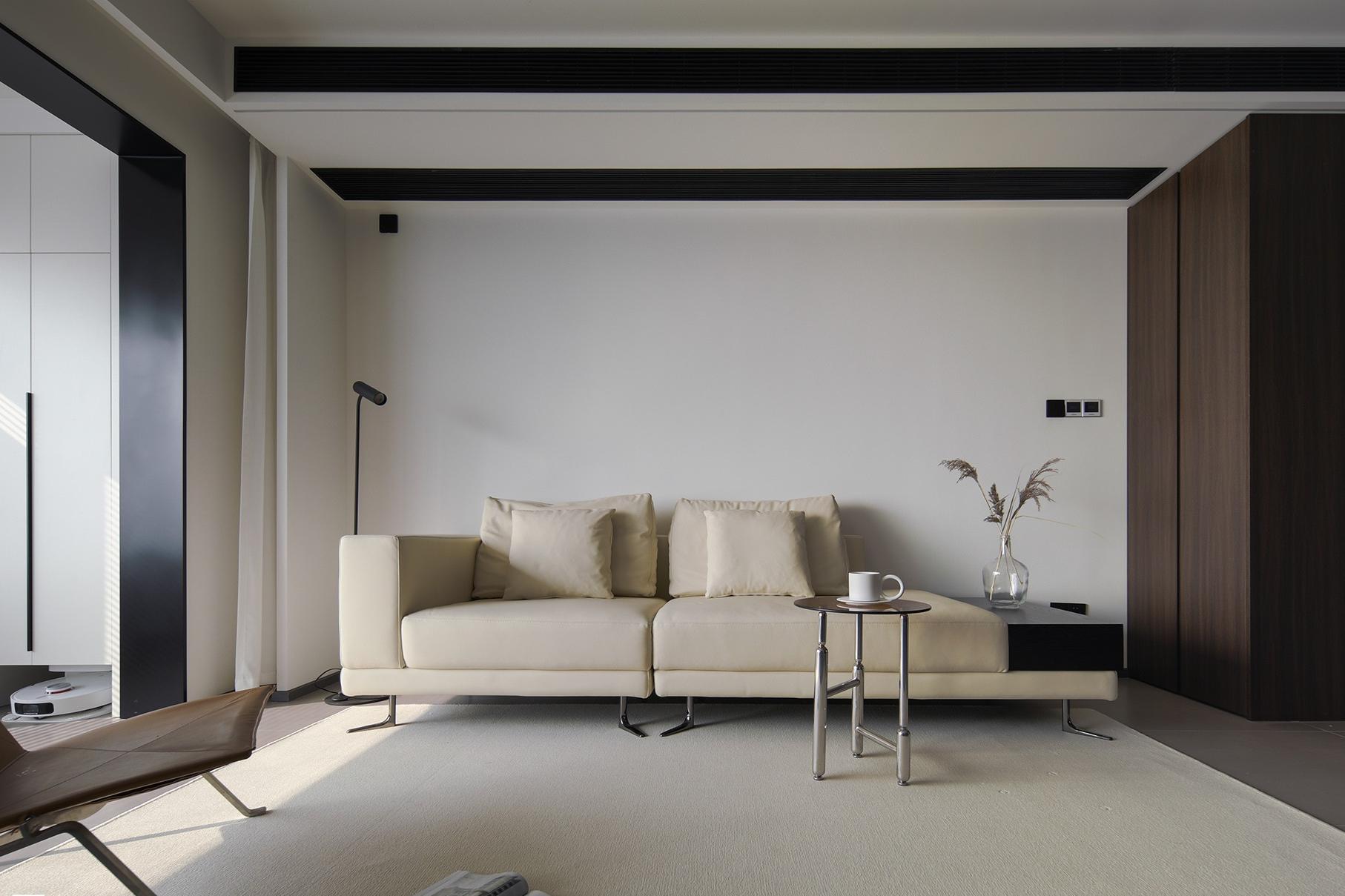 设计的初衷,来自业主提到的:简约大气但有质感的静谧空间。空间自入室的一刻起,便开始营造开阔却安静的节奏,深色处理空间的明暗关系,将重心引领向巨大的休闲阳台处。