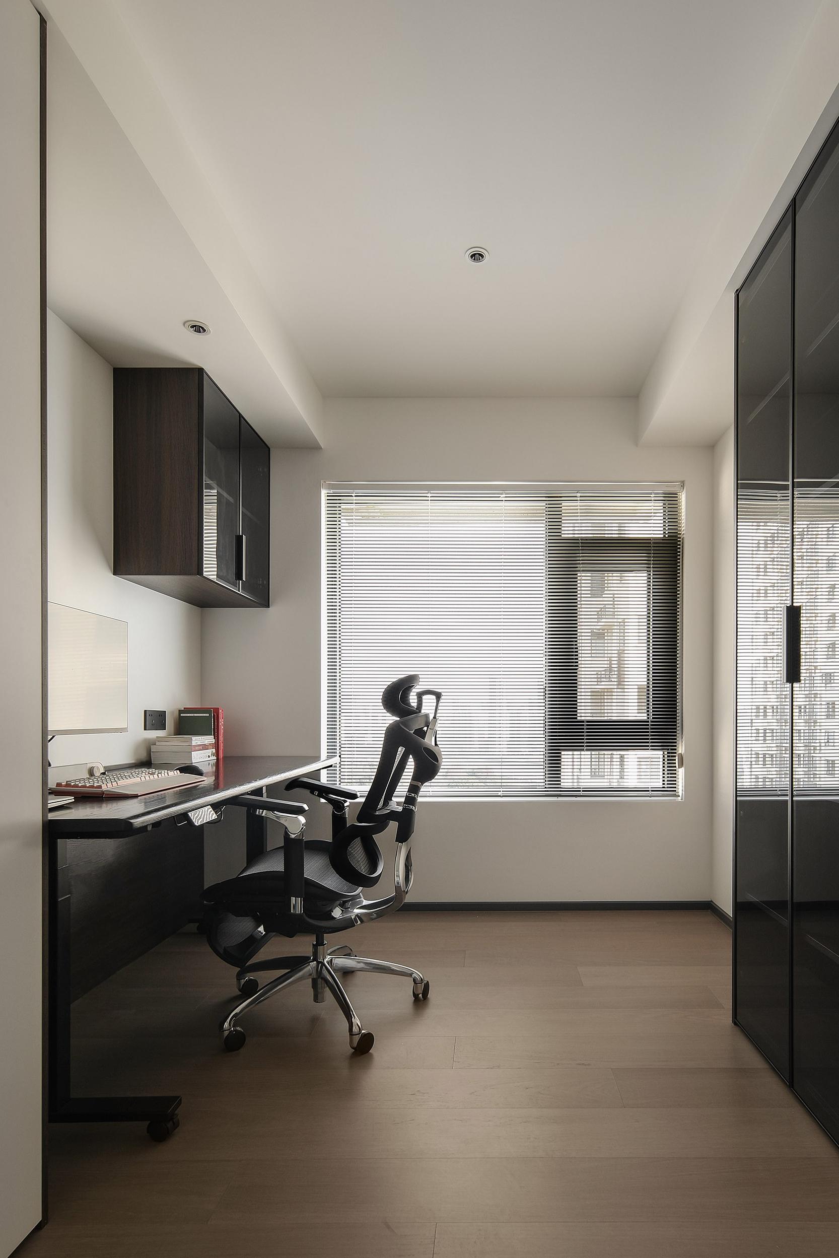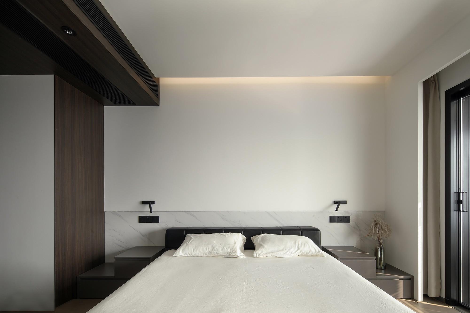 深色木饰面与白色墙体间形成分明的落差。主卧以现代简约主义为核心,将实用功能与视觉美学完美融合。卫浴以生活动线为基准,延续简明流畅的操作布局,将空间利用充分体现,塑造精致舒适的居住体验,持续探索实用美学的生活艺术。